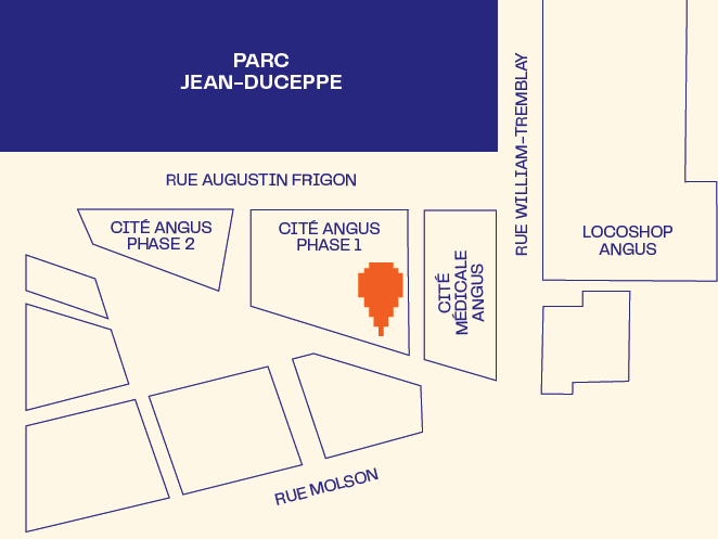 Espace Angus est situé au 4220 rue Augustin Frigon dans le local 100, à Montréal.